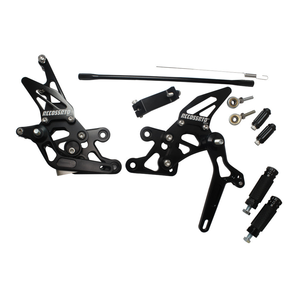 ACCOSSATO - race-developed for high performance Accossato Adjustable Rearsets for Yamaha FZ1 FZ8 (non-ABS) black Supports standard shift pattern Black anodised highlights Spare pegs, toe pegs and bushes available Model compatibility Yamaha FZ1 2006 - 2016 Yamaha FZ8 non-ABS 2010 - 2013 Part no: FT085N