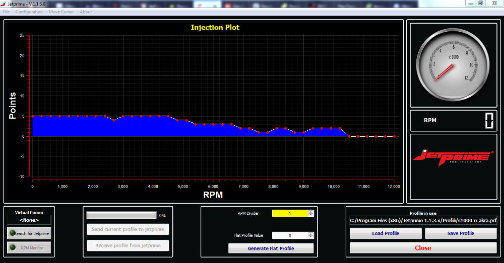 Jetprime - High Performance Tuning Made Easy Jetprime Programmable Power Module includes Jetprime Programmable Power Module Jetprime software Wiring harness Fitting and tuning instructions If you're looking for a easy route to big performance gains, then meet the Jetprime Power Module, the advanced programmable power module from Italy's no.1 performance tuning specialist. Using technology race-developed in World SBK, the Jetprime Power Module gives you control over your stock ECU's output, allowing you to create an ignition timing map perfectly suited to your bike. Essential if you've invested in an aftermarket exhaust and air filter and wnat to get most out of them. The Jetprime software features an easy-to-read graphical interface that allows you to create and adjust your map by simply clicking and dragging points on the graph. Once you're happy with the map you've created, you can save it for future use should you make further mods to your bike and need to modify the map again. If you ever need to return the bike to standard tune for any reason, simply remove the Jetprime module. So if you want to dramatically improve your bike's performance with minimal fuss, and without the need to reflash your stock ECU, the Jetprime Power Module is the perfect solution. How Does It Work? Featuring a Plug and Play system, the Jetprime module connects to the injectors, the air temperature sensor and to the 12v power via the iginition (to ensure there is no power absorption when the ignition is turned off). Using output from the air temperature sensor is key to the design because it allows the module to modify the ignition timing safely, without risk of damaging the engine should the settings be either incorrect or too high. Once the module is installed, download the Jetprime software and connect your PC / laptop to the module via USB. Then open the software and use the Search Jetprime button to locate the module. Once the module is located, the next step is to generate a map of the existing injection timing. To do this, first click on the RPM Monitor button. This starts the communication between the Jetprime power module and the bike's own ECU. Once the map has been generated, you can proceed to modify and test it as necessary in order to create a new map perfectly suited to your bike. Prerequisites PC / laptop with Windows XP, Vista, 7 or 8. Software can also be run on Windows 10 in compatibility mode.Test bench with dyno Part No. CJP012B-02 Model compatibility Aprilia Shiver 750 2008 - 2017