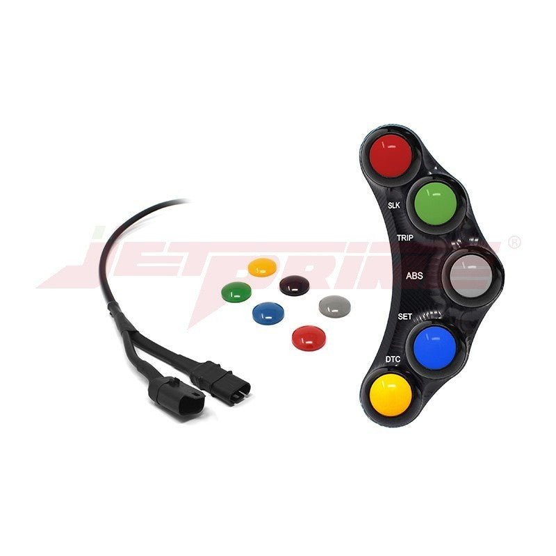Jetprime - Precision Control, Supreme Quality, Plug-and-Play Convenience Jetprime Plug and Play Left Side 7-button Switch Panel, race use only 7 buttons (5 front, 2 reverse) Choice of button colour combination Suitable for race use only If you're looking for rapid and precise control over handlebar functions, then look no further than Jetprime Button Switch Panels. Featuring true plug-and-play convenience, this Jetprime Switch Panel is interchangeable with the original and can be fitted in minutes, with no special tools required. Once fitted, your bike will be ready to go with full race functionality. Machined from aluminum alloy 7075, and using IP67 military spec waterproof switches that provide 1 million cycles of fatigue resistance, it's no wonder that Jetprime is the switch panel of choice for leading race teams including Barni Ducati and Althea BMW. includes Switch panel with wiring harness Selection of coloured buttons Operating instructions Part No. JPPLSR028 Model compatibility BMW S1000RR 2009 – 2014 BMW HP4 2013 – 2015