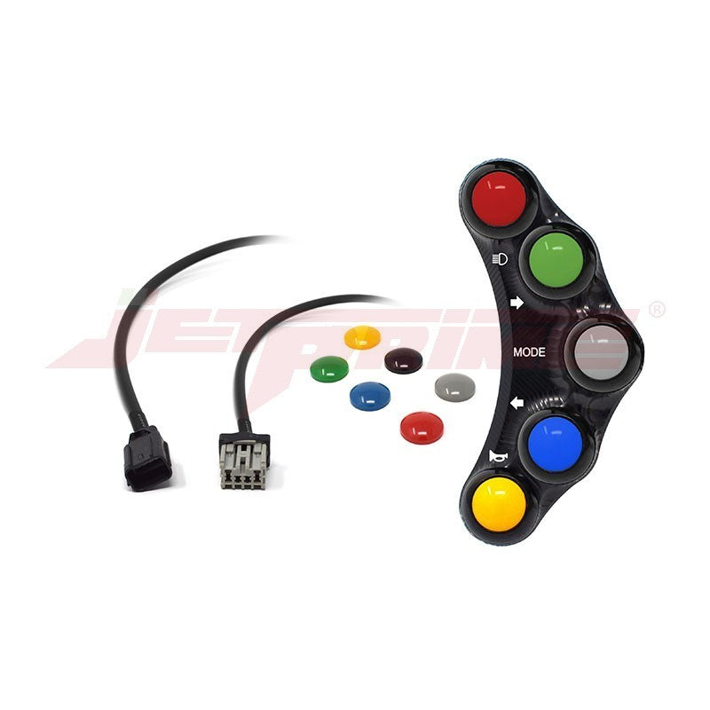 Jetprime - Precision Control, Supreme Quality, Plug-and-Play Convenience Jetprime Plug-and-Play Left Side 8-button Switch Panel, STREET uses stock functions includes STREET Switch panel with wiring harness Selection of coloured buttons Operating instructions If you're looking for rapid and precise control over handlebar functions, then look no further than Jetprime Button Switch Panels. Featuring true plug-and-play convenience, this Jetprime Switch Panel is interchangeable with the original and can be fitted in minutes, with no special tools required. Once fitted, your bike will be ready to go with original functions. Machined from aluminum alloy 7075, and using IP67 military spec waterproof switches that provide 1 million cycles of fatigue resistance, it's no wonder that Jetprime is the switch panel of choice for leading race teams including Barni Ducati and Althea BMW. Part No. JPPLS017 Model compatibility Honda CBR1000RR SP SP2 2017 - 2019