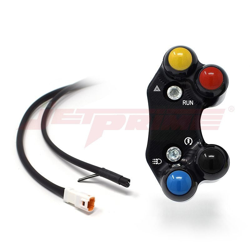 Jetprime - Precision Control, Supreme Quality, Plug-and-Play Convenience Jetprime Plus-and-Play Right Side 4-button Switch Panel designed for use on bikes with OEM or Brembo RCS master cylinder uses stock functions includes Switch panel with wiring harness Selection of coloured buttons Operating instructions NB. The switch has vertically aligned mounting holes and is designed to mount onto OEM, Brembo RCS or other master cylinder which has vertically aligned mounting holes. If you're looking for rapid and precise control over handlebar functions, or perhaps just want the race look of a top level SBK machine, then look no further than Jetprime Button Switch Panels. Featuring true plug-and-play convenience, this Jetprime Switch Panel is interchangeable with the original and can be fitted in minutes, with no special tools required. Once fitted, your bike will be ready to go with original functions. Machined from aluminum alloy 7075, and using IP67 military spec waterproof switches that provide 1 million cycles of fatigue resistance, it's no wonder that Jetprime is the switch panel of choice for leading race teams including Barni Ducati and Althea BMW. Part No. JPPLD006 Model compatibility Hypermotard 950 2019 - current Monster 821 2019 - current Monster 1200 / S 2019 - current Scrambler FULL THROTTLE 2019 - current Scrambler ICON 2019 - current Scrambler CAFE RACER 2019 - current Scrambler DESERT SLED 2019 - current Scrambler 1100 2019 - current SuperSport  2017 - 2019